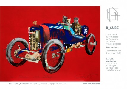 ...Collages, peintures, aquarelles, sculpture et objets de curiosité sont au rendez-vous. Des boîtes de GI Joe des années 70, aux affichettes de coureurs automobiles du début du siècle dernier, en passant par les légendes québécoises, les éditions anciennes du National Geographic (auquel il était abonné, à l'époque, pour 5$/an), les livres illustrés du XIXème... Jean Lambert détourne, pixelise, assemble, rapièce, colle, peint, superpose un nombre incalculable d'éléments qui se confrontent et se répondent. Une signature d'enfant au dos, le soldat au chapeau colonial triomphant sur sa Jeep, n'a plus le même écho... Une perruche perchée sur le ruban de Möbius toise l'étranger, victorieuse... Un pilote vient sauver d'impassibles gentilshommes, juchés sur un scarabée aux pattes folles, sans se soucier du radeau perdu de la Méduse... Chaque œuvre à sa propre histoire, dont l'envergure des détails méritait bien un fascicule [voir page 5]. C'est ainsi que le collectionneur peut s'imaginer sa propre version accompagné, s'il le souhaite, du manifeste. Évidemment la pop-culture est présente, mais ce n'est pas la résonance de cette exposition. C'est une aventure touchante, entre Québec et France, où l'insouciance des accessoires prend tout son sens.